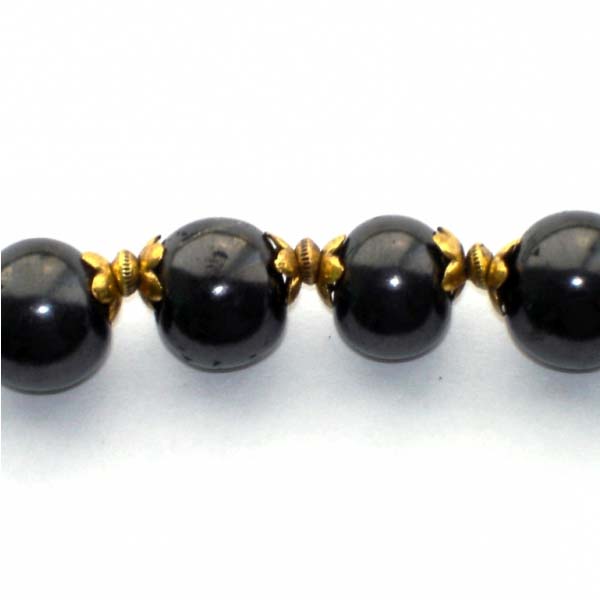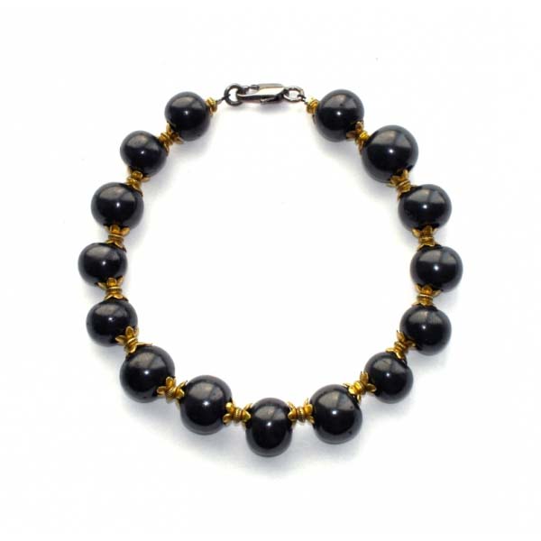 The length of the bracelet is 17 cm. The diameter of each bead is 9 mm. There is a flower bead between each shungite bead.